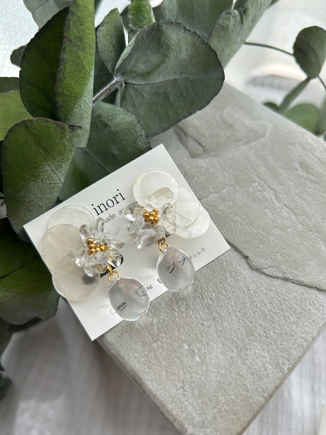 クリアビーズをたくさん使ったデザインのアクセサリーです。 透明感がありどんな服にも似合うので、オケージョン使いもおすすめです。 全長約 7cm ♡素材♡ メイン: イヤリング:ニッケルフリー(有料でサージカルステンレスへ変更可能) ピアス:サージカルステンレス